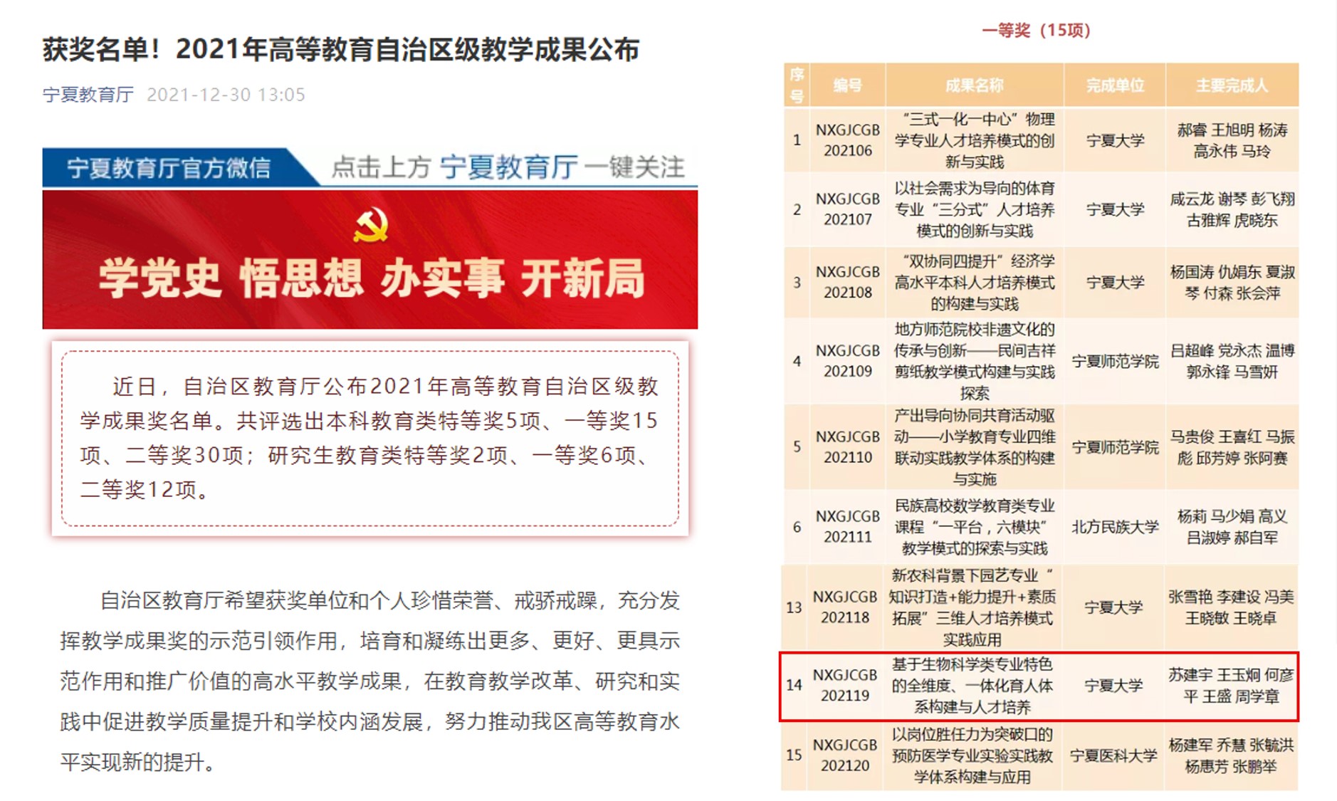 近日,自治区教育厅公布2021年高等教育自治区级教学成果奖名单,91九色