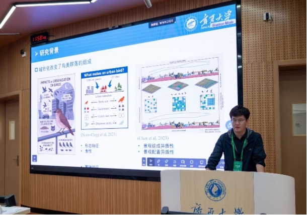 学院动物学学科团队杨英副教授、杨文治副教授带领博士研究生赵富强、袁鹏参加了本次盛会。博士生赵富强通过大会学术委员会遴选,在“鸟类群落生态学研究”分会场中作了以《快速城市化格局下的蓝绿基础设施鸟类群落β多样性及其驱动因素》为题的口头报告。报告系统介绍了基于景观生态学探究银川市蓝绿基础设施的鸟类群落构建格局及其驱动机制的最新研究成果,报告内容受到多位专家学者的关注与热烈讨论,充分展示了学院青年科研人员在鸟类生态学领域的研究实力与创新能力。目前该研究成果以宁夏大学生命科学学院为第一研究单位,张大治教授为通讯作者,发表于国际鸟类学领域期刊Avian Research(中国科学院分区:一区TOP,论文链接://doi.org/10.1016/j.avrs.2025.100316)。本次会议上博士研究生袁鹏也通过壁报交流等形式展示了最新科研进展。