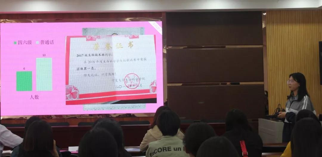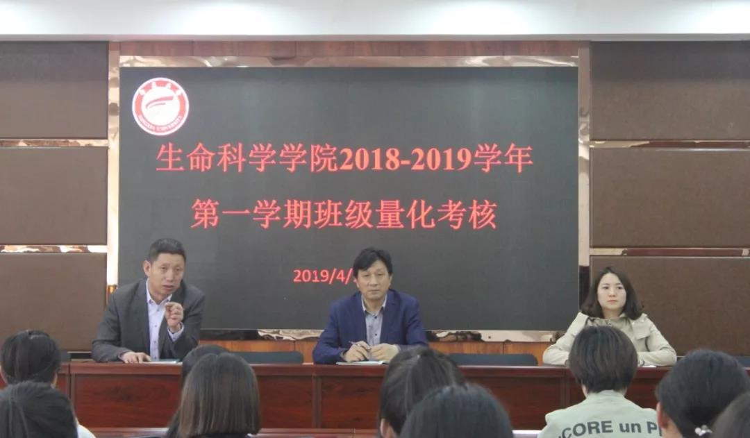 4月10日下午生命科学学院在文萃校区知本楼报告厅举行了2018-2019学年第一学期班级量化考核汇报会。院党委副书记叶志春、何彦平出席会议,院团委书记兼学生工作办公室主任杨亚珺,各班班长、团支书、学习委员及院团委学生会成员参加考核汇报会。