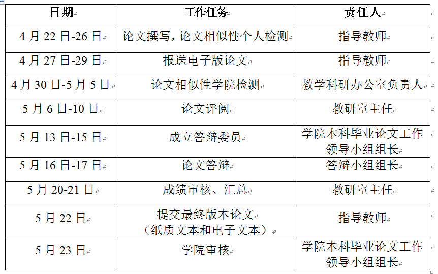 根据《宁夏大学2018—2019学年第二学期教务工作时间、任务流程》安排和《宁夏大学本科毕业论文(设计)相似性检测实施办法(试行)》(教务处〔2019〕9号)相关要求,经学院本科毕业论文工作领导小组研究,制定我院2019届本科生毕业论文答辩工作日程安排如下: