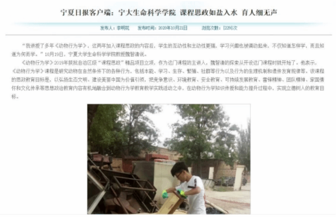 教师团队由6人组成。魏智清主持研究。生命科学学院书记沈岩东为课程共建人,负责把关课程思政与思政课程同向同行。杨贵军教授负责行为案例选编。杨涓教授负责行为生态学、保护行为学案例选编。赵红雪教授负责思政元素梳理。张东涛教授负责解释行为的生理机制。