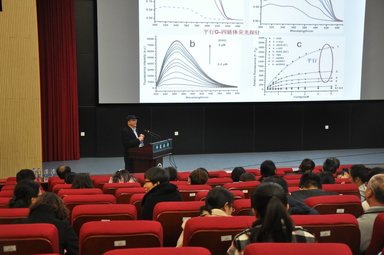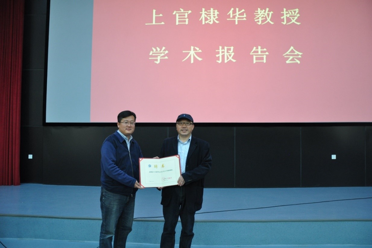 访问期间,上官棣华教授参观了我院西部特色生物资源保护与利用教育部重点实验室,并与学院科研骨干进行了座谈交流。3月29日下午,在宁夏大学贺兰山校区科技楼报告厅,上官棣华教授为生命科学学院、化学化工学院的师生作了题为“功能核酸的分子识别与应用”的精彩学术报告。报告会由宁夏大学校长助理、党委常委马涛主持。报告会结束后,马涛向上官棣华教授颁发了宁夏大学兼职教授聘书,并希望生命科学学院、化学化工学院加强与中国科学院化学研究所的沟通与合作,产出高水平科研成果,促进宁夏大学“双一流”建设工作。