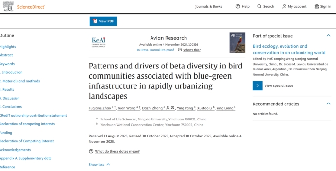 学院动物学学科团队杨英副教授、杨文治副教授带领博士研究生赵富强、袁鹏参加了本次盛会。博士生赵富强通过大会学术委员会遴选,在“鸟类群落生态学研究”分会场中作了以《快速城市化格局下的蓝绿基础设施鸟类群落β多样性及其驱动因素》为题的口头报告。报告系统介绍了基于景观生态学探究银川市蓝绿基础设施的鸟类群落构建格局及其驱动机制的最新研究成果,报告内容受到多位专家学者的关注与热烈讨论,充分展示了学院青年科研人员在鸟类生态学领域的研究实力与创新能力。目前该研究成果以宁夏大学生命科学学院为第一研究单位,张大治教授为通讯作者,发表于国际鸟类学领域期刊Avian Research(中国科学院分区:一区TOP,论文链接://doi.org/10.1016/j.avrs.2025.100316)。本次会议上博士研究生袁鹏也通过壁报交流等形式展示了最新科研进展。