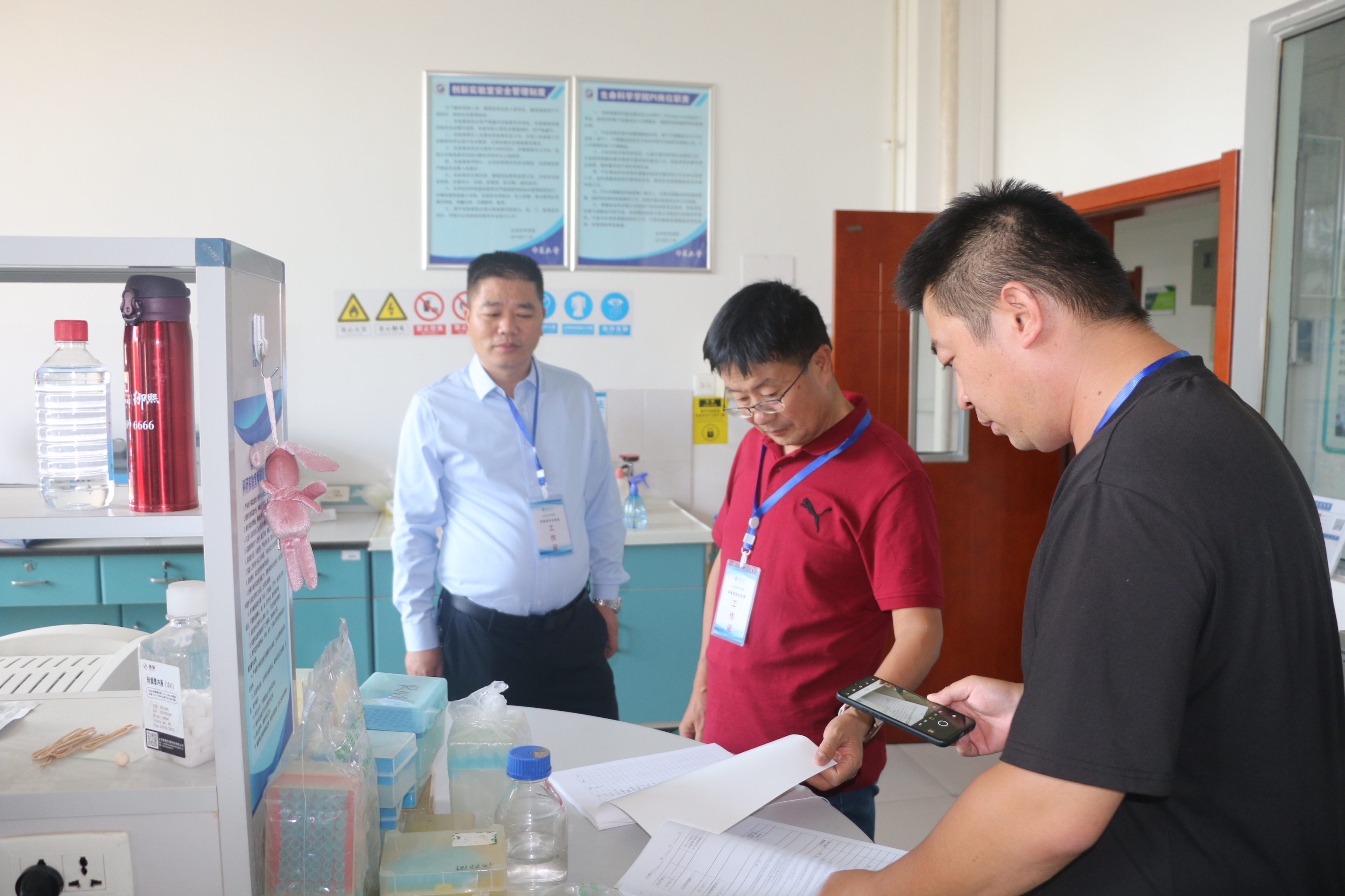 为落实《自治区科技厅关于全区高新区和科技创新平台切实落实安全生产管理任务的通知》(宁科高字〔2022〕53 号)和学校有关要求,做好新学期实验室安全工作,保障实验室人员和财产安全,2022年9月8日,学院实验室安全领导小组对文萃校区知本楼、民志楼、饲料工程中心各科研实验室仪器设备的规范操作和管理、用水用电安全、危化品管理及使用、实验室日常安全检查记录、垃圾分类、废液收集及处置等方面进行了全面检查。检查组对存在的问题要求各实验室立即整改,确保实验室安全,保障科研任务有序开展。